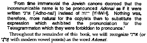 To the reader unfamiliar with the importance of the divine name, we must give this brief explanation. The divine name is written יהוה (YHWH) in the Hebrew Scriptures. The New World Translation (and a limited number of other English Bibles) appropriately translated these four Hebrew letters (the Tetragrammaton) with the English name Jehovah. In contrast, the Hebrew word Adonai is not a name. Rather it is a title. However, as we will see in the quotation below, during certain periods of Jewish history, Adonai was used in place of the divine name to avoid pronouncing יהוה.