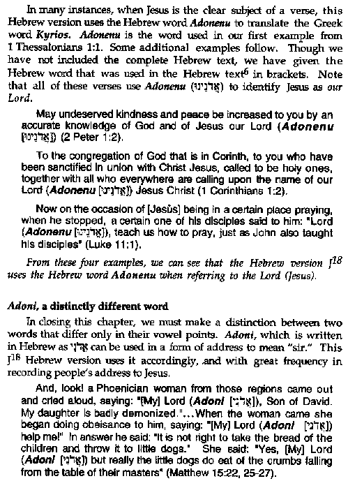 However, in the Hebrew version identified as J18, Adonenu is generally applied to Jesus. An example of Adonenu used to identify Jesus is found at 1 Thessalonians 1:1.[5] The English wording is from the New World Translation: