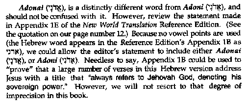 Before going further, we need to explain the difference between Adonai and Jesus' customary title Adonenu. Adonai is rendered as Sovereign Lord in the Hebrew Scriptures of the New World Translation. Appendix 1E (page 1566) of the New World Translation, Reference Edition, 1985, says: