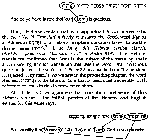 Reliance on Hebrew versions to supplant the Greek text of the Kingdom Interlinear Translation is an acknowledgment by the New World Bible Translation Committee that these Hebrew versions carry greater authority in the 237 Jehovah references than do the best extant Greek manuscripts which universally use Kyrios.[1] Consequently, for at least the 237 Jehovah references found in the New World Translation Greek Scriptures, these versions are elevated to the level of inspired Scripture.[2] As a result, we must examine these versions to determine their use of the Tetragrammaton and other titles of God, and not merely the presence of the Tetragrammaton. It is appropriate not only to look at the references that translate Kyrios as Jehovah, but also to evaluate related verses that refer to Hebrew titles for God such as Adonai. Ideally, we would examine all 25 Hebrew versions used for textual support[3] of the Tetragrammaton within the New World Translation Christian Greek Scriptures. We are limited, however, to the two Hebrew versions at hand that, nonetheless, give us an insight into the meaning of the words chosen by the Hebrew version translators.