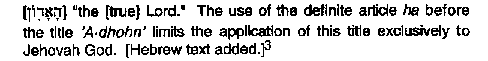 The title 'A.dhohn', "Lord; Master," when preceded by the definite article ha, "the," gives the expression ha.'Adhohn', "the [true] Lord." The use of the definite article ha before the title 'A.dhohn" limits the application of this title exclusively to Jehovah God.