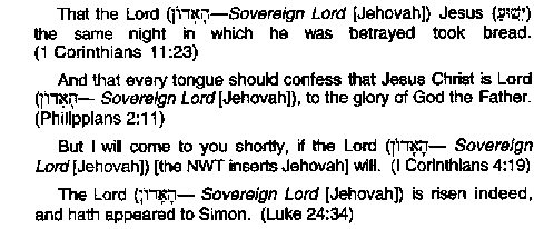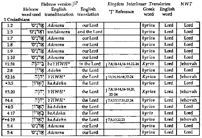 The most disturbing evidence, however, comes from J17. From 1 Corinthians we discover that the New World Bible Translation Committee translates haAdohn as Jehovah three times and as Lord 16 times. HaAdohn was selectively translated as both Jehovah and Lord, suggesting that the selection was possibly based on a theological predisposition rather than the Committee's stated grammatical translation rules.