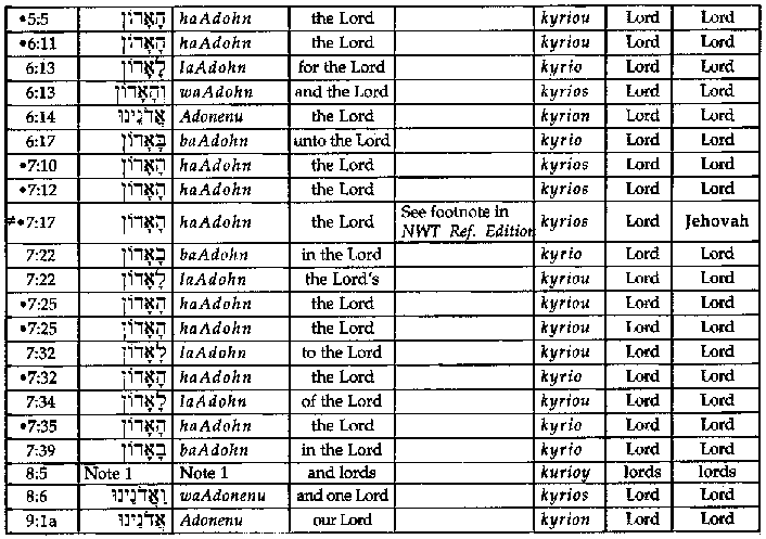 [6] These verses are quoted using the English wording of the New World Translation while showing the Hebrew characters used in the Hebrew version. In each case, the Hebrew word is a translation of the Greek word Kyrios.