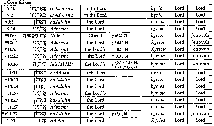 The following table lists all the Kyrios (Lord) verses found in 1 Corinthians. The purpose of this study is to evaluate the number of occurrences of the Hebrew word haAdohn in a randomly selected Christian Scripture book. According to the statement above, all references to haAdohn—whether in the Hebrew Scriptures or in a Hebrew version—should be translated Jehovah in the New World Translation.