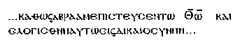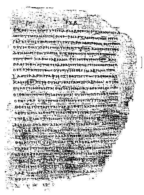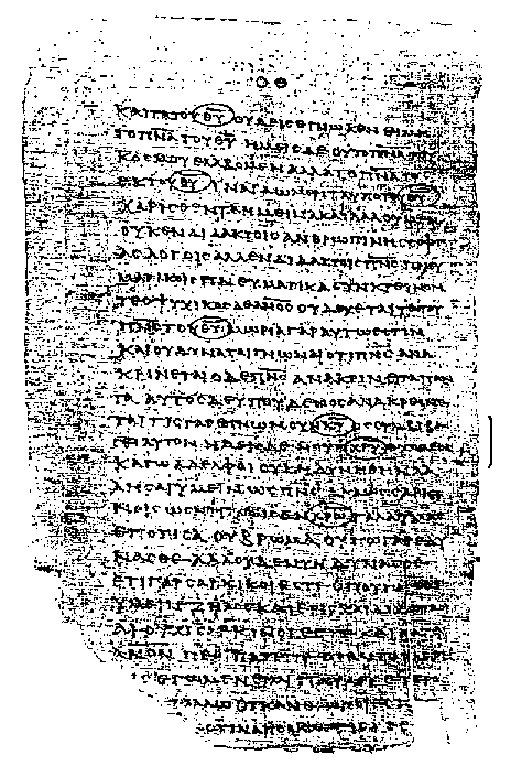 f.83.r. Greek manuscript date: circa 200 C.E. Plate contains: Galatians 3:2 to 15. Reference cited: Galatians 3:6. Significance of this example: Use of a surrogate (abbreviation) form of the word Theos (God). The word θεω is abbreviated as θω (with an overline). Translation used in New World Translation: "Jehovah." Translation used in Kingdom Interlinear Translation: "God." Earliest date reference for the translation choice: New World Translation-"Jehovah": A Hebrew version; 1599. Kingdom Interlinear Translation-"God": This manuscript; circa 200 C.E. Textual form. Manuscripts from this period did not use spacing between words, and broke words at the end of a line. No accent or punctuation marks were used. Surrogate examples are evident. |