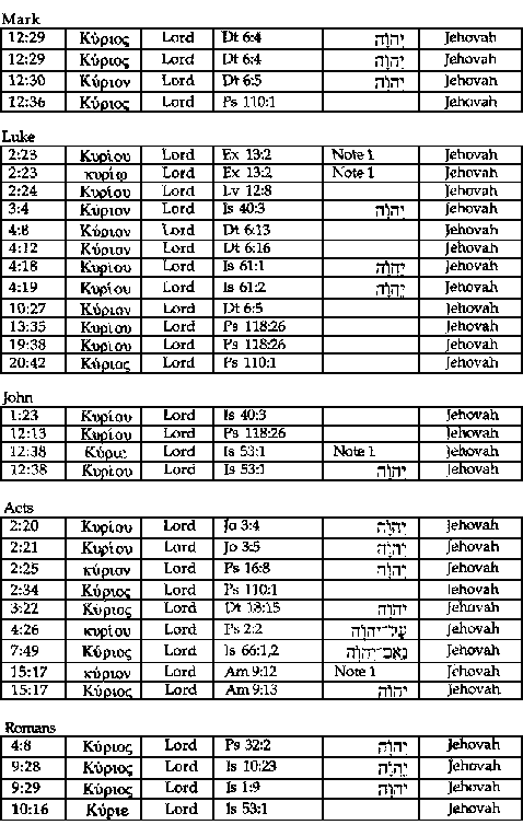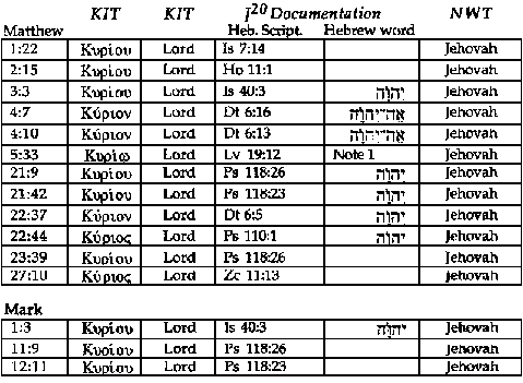 This is a definitive reference in our study of the Tetragrammaton in the Greek Scriptures. J20 precisely identifies each instance in the Greek Scriptures in which there is specific Hebrew Scripture use of the Tetragrammaton in the passage quoted in the Christian Greek Scripture. We have not included the references which contain Jah from Hallelujah (of which there are only four in the Greek Scriptures, all in Revelation). That is, only the 44 occurrences of h/:hy] as found in this reference would clearly fulfill the criteria of the New World Translation when they state (Reference Edition, Appendix 1D):