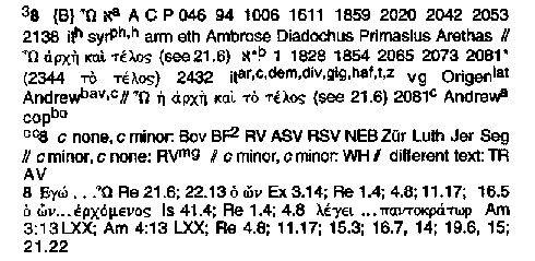 In the first section of this appendix, we will briefly compare the footnote material found in the UBS reference for Revelation 1:8 with that of the Kingdom Interlinear Translation for the same verse. We have chosen this verse merely because we are already familiar with its use in the Kingdom Interlinear Translation and because it represents a textual problem in another part of the wording.