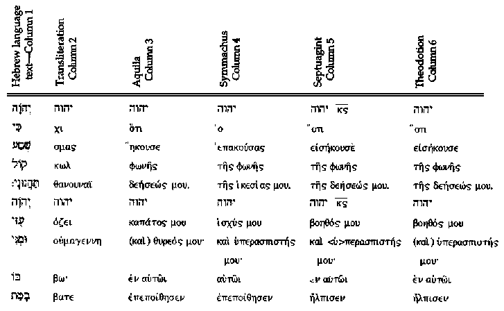 We then discover that Origen transcribed יהוה into the Greek text of columns 3 (Aquila's translation), 4 (Symmachus' translation), and 6 (Theodotion's [or the Quinta] translation). Though we find occasional Greek lettering which Origen included with the Tetragrammaton, we discover that these are merely articles meaning "the" (tou`, tw`i [a scribal error which should read tw`/], and toŸn), prepositions (ejpiŸ meaning "upon," and ejn meaning "in") or a further elaboration of the divine name in the Psalms 45 and 88 entries.