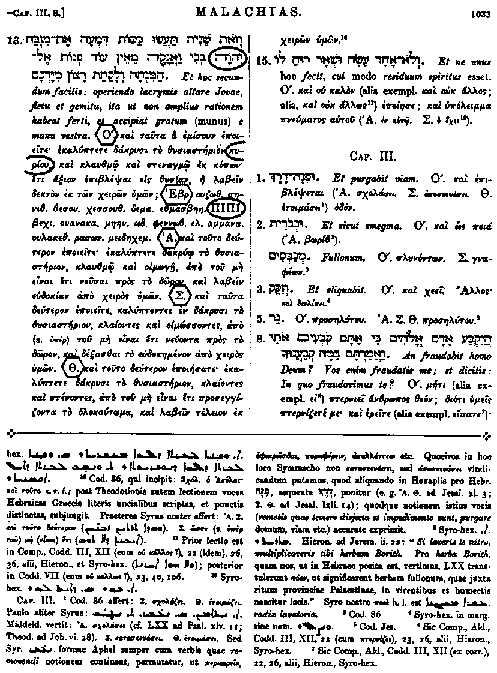 In contrast to the original six columns used by Origen, Field grouped all entries for a given word or phrase into a single paragraph with each entry identified by Origen's original column headings. The complete entry for Malachi 2:13 as shown in the Origenis Hexaplorum is reproduced in Figure 12. All the Hebrew and Greek entries are reproductions of the work of Origen himself. The Latin explanations in either the main entry or the notes are the work of the modern editor of this volume. The notes in Greek or Syrian are presumably the textual apparatus which identifies the editor's sources of textual information.