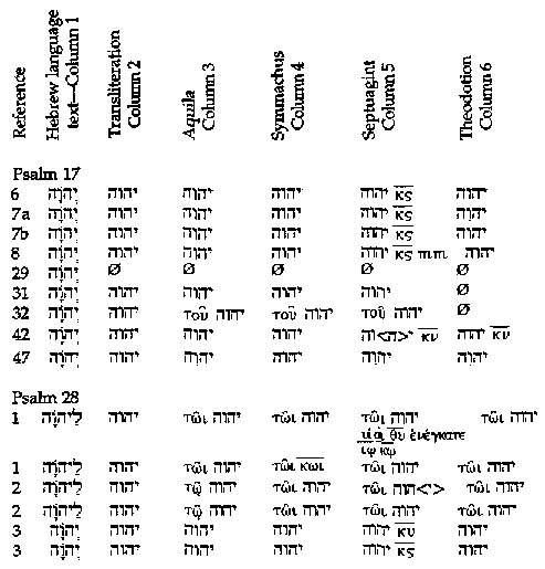 Even more surprising, however, is Origen's entry in the Septuagint column at Psalm 17:8. In this verse he recorded the Septuagint as using either יהוה or one of the Greek forms k-"- or pipiŸ.