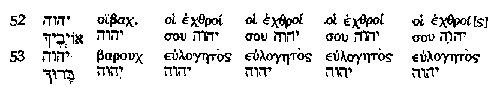 By oversight ver. 7 is repeated. Iota adscript occurs [on two separate lines]; accent and breathing marks are provided even for the transliteration of the Hebrew. The Tetragrammaton is written in square Hebrew letters, followed, in the Septuagint column, by the contraction for Κύριος (in ver. 8 on the next page k-"- is followed by pipi…).