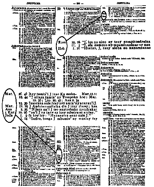 By comparing reference order in this missionary translation concordance, it is apparent that Asa is Acts and Joda is Jude.[2] The other Bible book names are easily determined by spelling similarity and sequence. The following Malagasy Bible references use Jehovah in the Christian Scriptures: